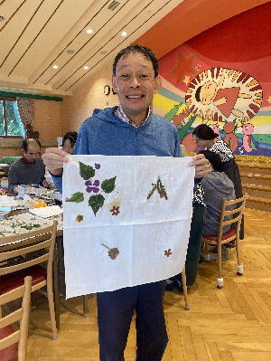 韓国の皆さんが準備をして来て下さり、一緒に摘んだ野の花を白いハンカチの上に置き、その上からスプーンでトントンと叩いて染める「たたき染め」をしました。