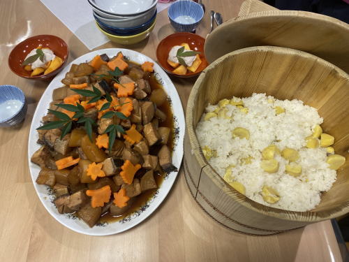11月9日はひと月に1度の家族の会。献立は、栗ご飯、ぶり大根、柿の白和え、シジミ汁(NHKの朝ドラをみんな楽しみに観ていますが、それに出てくるしじみ汁があまりにも美味しそうなので)デザートは抹茶ゼリーでした。秋をたくさん感じるご馳走を、ご家族の方と楽しくいただきました。